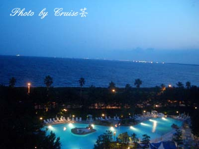 而此時天色已慢慢變黑,沒法子只好認命回旅館拿眼鏡了,嗚~~來回飯店要花一小時耶!(坐單軌電車從飯店到海洋只要一站但從海洋回飯店要繞一整圈)。回飯店看到晚上的游泳池時又忍不住拿起相機狂拍,好美哦~~~~