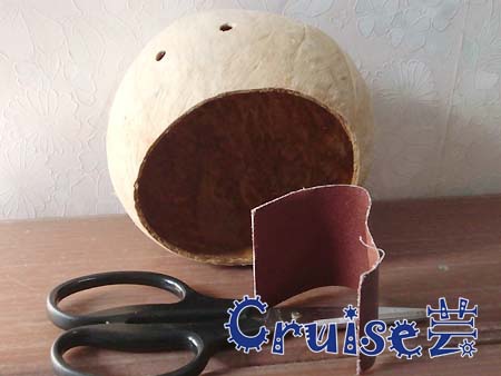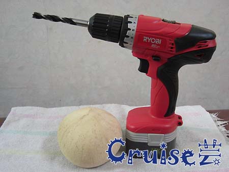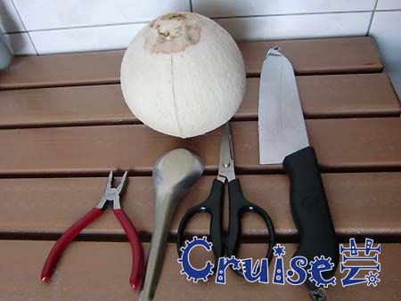 椰子、鉗子、剪刀、湯匙、電鑽、粗砂紙。