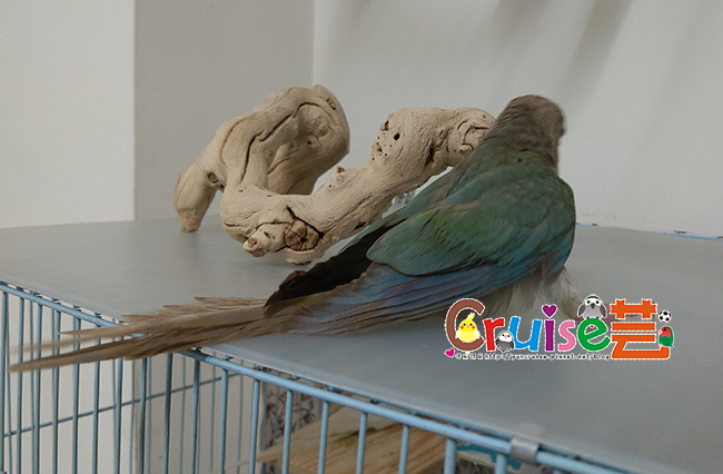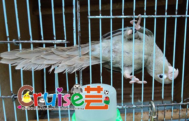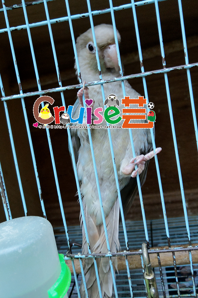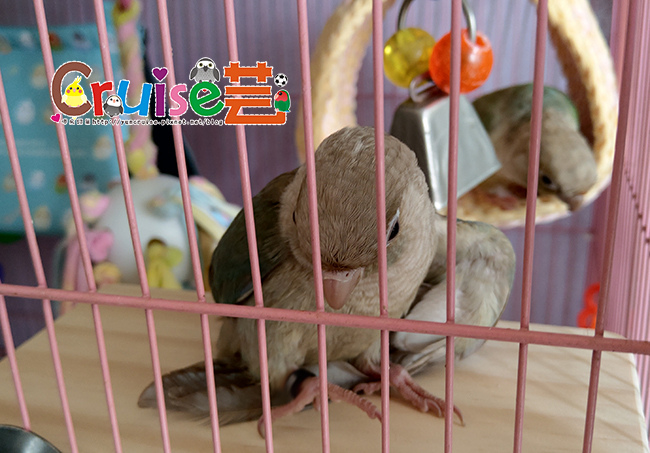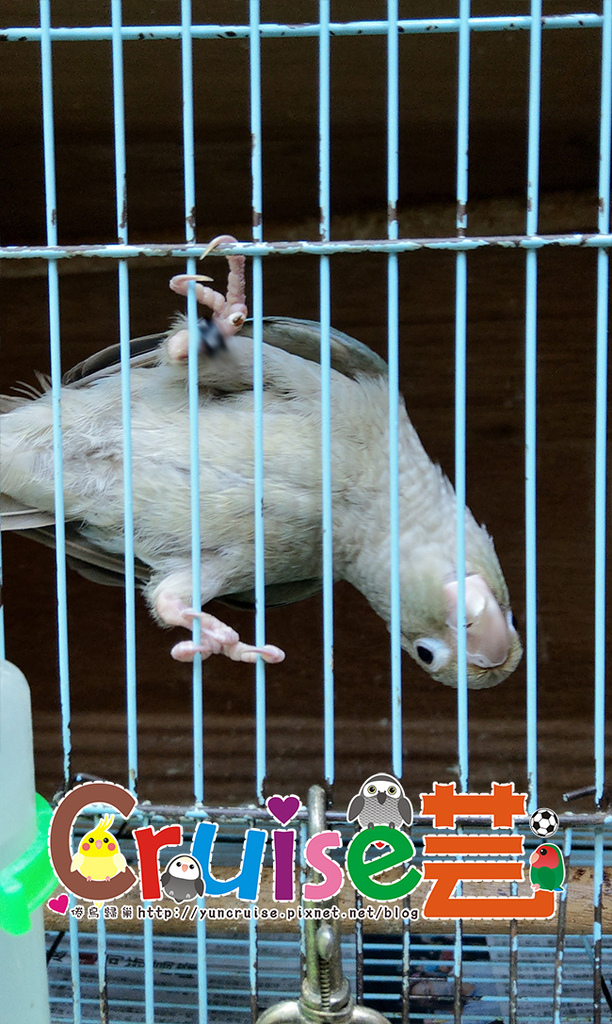 跟牠講話時,整隻在籠門上,上上下下搖晃,站在棲木弄到自己尾羽又跟尾羽生氣,感覺是個腦袋有洞的小笨蛋,超有趣、超瘋癲,跟牠玩了好久,順口問了一下牠的狀況,這位過動小嗨咖,藍化肉桂、約三~四個月大而已,沒驗公母,腳趾頭是之前學站站台時受傷的、價位完全能手滑,好心動!!