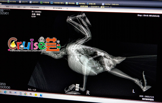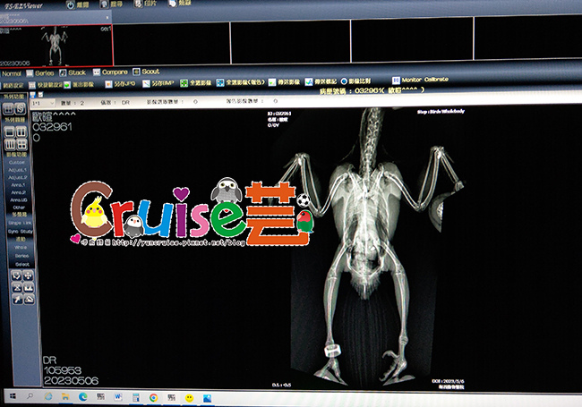 去照完X光後,鏘鏘暄被助理姨姨認證有鏘但也說牠很乖,沒有亂咬人。髖關節、大腿骨看起來都正常,雙腳也沒有出現骨折過的痕跡,腳型目前看起來也正常,會有那些奇怪的動作,可能是之前受傷時腳很痛,自己找到比較不痛的姿勢發展出來的(也習慣不正常的姿勢),目前暄看起來沒有痛也無任何禽掌炎的徵兆,腳掌、腿都粉嫩嫩(沒有黑黑處),就無需開藥或治療,只是將來老年後,牠可能會比同齡鳥更早出現劈腿、抓握差的腳部退化情況,需要更注意有沒有禽掌炎,體重不能太重、棲木不要太光滑之類的生活細節,扣除肌胃裡那二顆不明物體(劉醫師說牠這麼小就有亂吃東西,要注意),基本上暄的X光可以當完美範例了,是個健康寶寶。(可惜鳥無法測智商呀!)