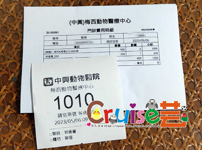 在候診區,助理先看了一下暄之前傷疤的照片和現在腳的癒合情況,也看了牠那神奇的坐翅膀照片且我一直和她說牠除了腳有問題外,可能智商也有點問題,行為太鏘了!