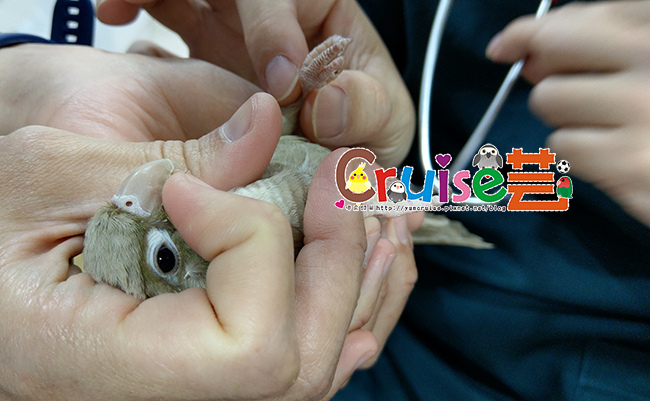 量完體重,暄在診間飛飛,一會想停在劉醫師頭上、一下跑去助理頭上,最後降落在我頭上,看了暄的飛行狀況,發現牠飛得時候腳沒有收起來(我根本沒注意牠飛行中的樣子),除了一屁股坐姿降落外,翅膀的收合也不夠貼緊。抱暄觸診,說牠屁毛弄得亂七八糟(跟旬剛來時一模一樣的爆炸屁毛),拉拉腳,發現牠的左腳有點鬆,有可能是小幼幼期被親鳥或手足壓到或是站站台時有拉扯到,推測是軟組織、肌腱、韌帶有問題,若是運動員可以做核磁共振治療但鳥沒辦法。