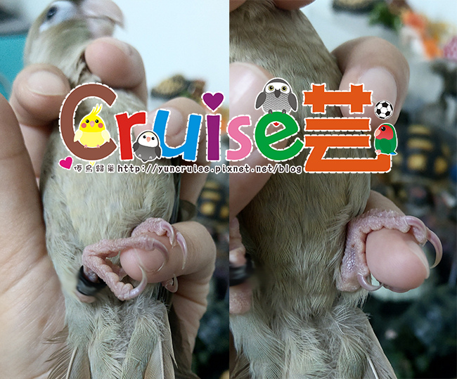 回家,噴噴樂噴完後,馬上剪掉那尖又過長的趾甲,檢查斷趾處傷口癒合的情況,這孩子不知道是年紀太小搞不懂狀況還是天性阿呆,從鳥店鳥籠抓出來(我自己抓)、進外出籠,陪我去人類聚會後才回家,全程乖乖,沒緊張或過嗨,抱牠也是任我翻、隨我摸、任我處置。