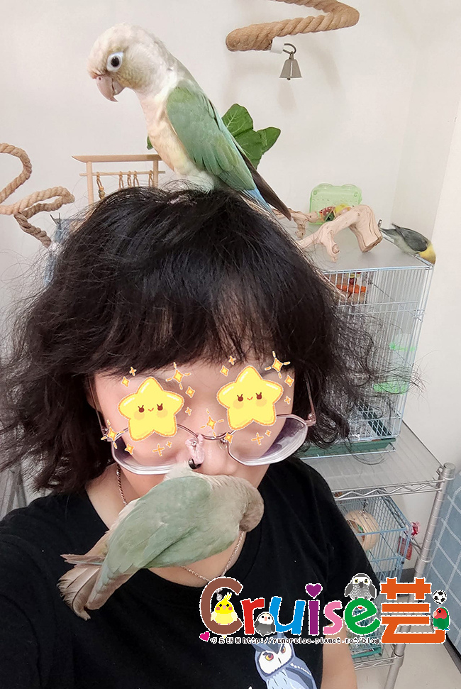 如往常到常去的鳥店幫孩子們補糧、補貨,照例每籠看看、每戶瞄瞄有誰,今天有好幾對太平洋,各種花色都有,一隻和蜂蜜一模一樣的綠華勒太平洋映入眼前,紅眼,那不太一樣的綠,是隻剛斷奶、開始自己吃的小女娃呀!第一次現場遇到和蜜一樣的孩子,各種情緒湧現,多看了牠好幾眼,再後裡面走,突然看到一隻藍化小太陽抓著自己的腳腳躺在飼料碗上玩,發現我在看牠,馬上起身要站好,過程中不小心卡到自己的翅膀跟翅膀吵架了一下,媽呀!這孩子也太好笑了吧!