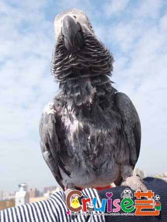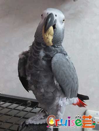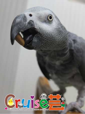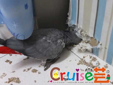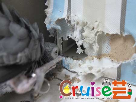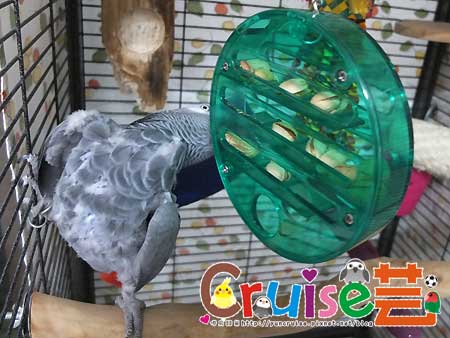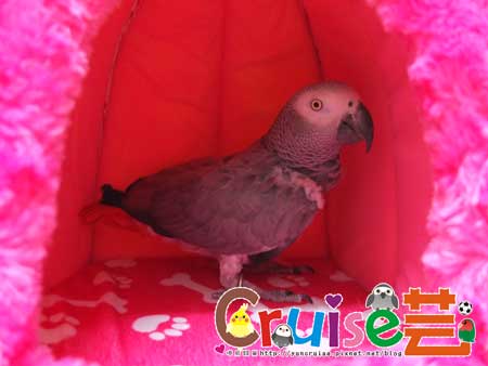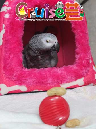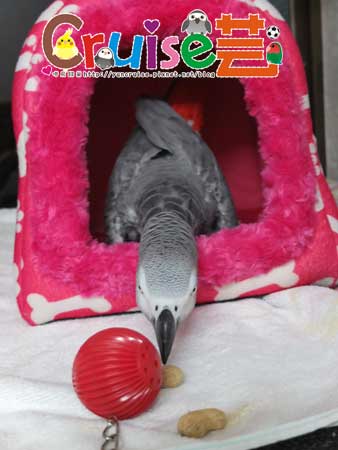 在布窩裡踢踢踢看到發聲球瞬間變身並發出灰鸚原始的聲音(牠只有生氣和害怕才會發生這種聲音)